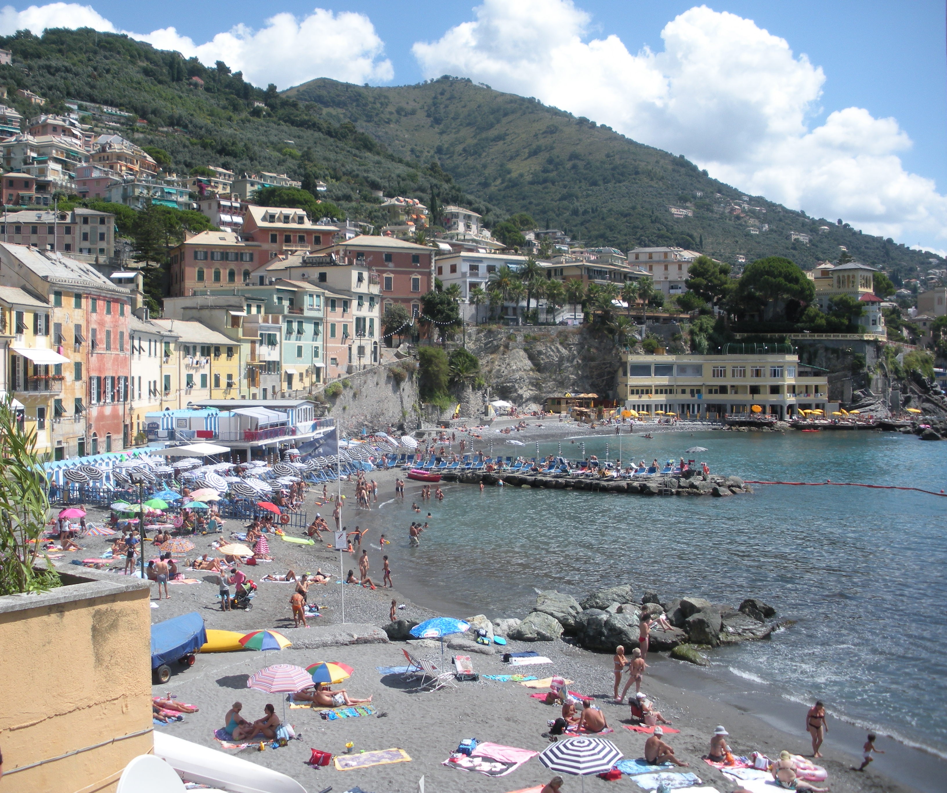 Krótka wspinaczka po schodach stromych niczym drabina kończy po jakimś czasie błogie, nadmorskie lenistwo. Znowu stawiam stopy na alejce, która doprowadziła mnie w to malownicze miejsce. Po paru minutach zza murów nadmorskich willi wyłania się główna plaża miasteczka. Rzut oka wystarczy mi, by przekonać się, że niczego na tej mniejszej i kameralnej nie straciłem. Ale jedynie z powodu liczby ludzi, bo urokowi tej najważniejszej w Bogliasco plaży także niewiele można zarzucić.